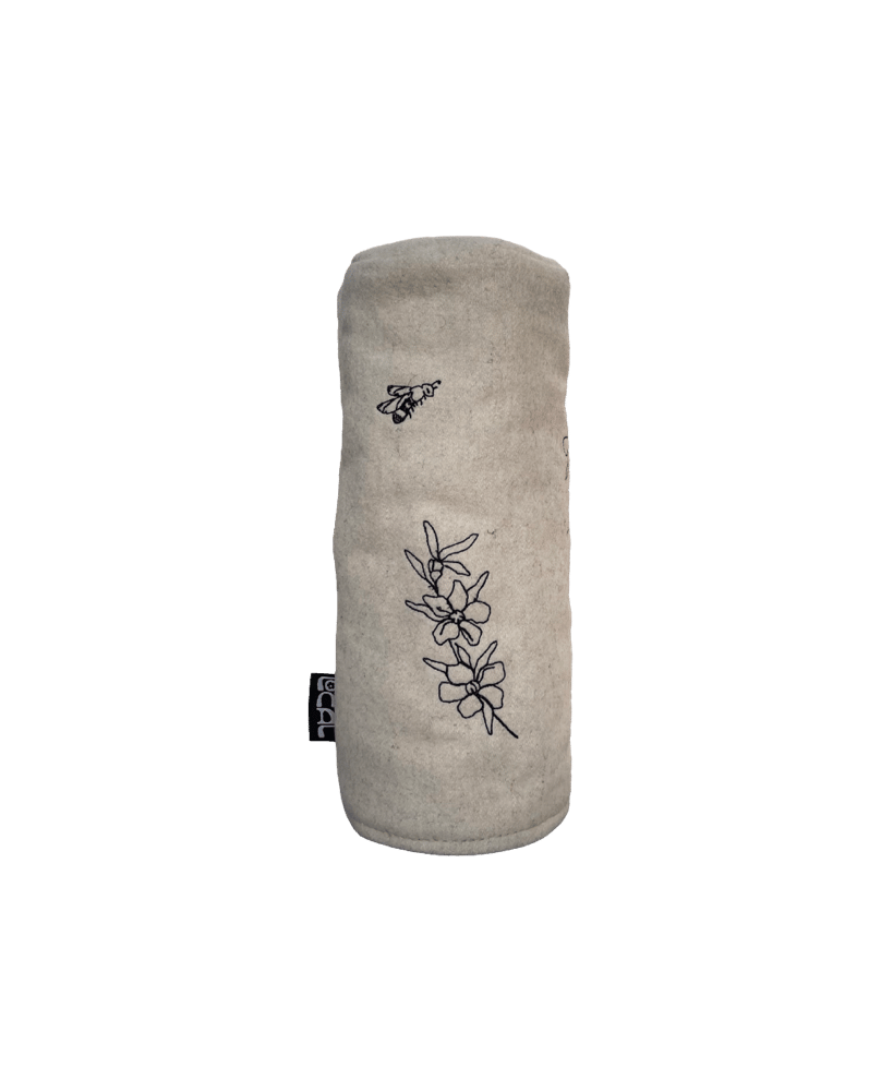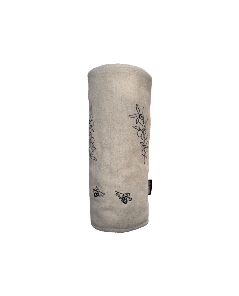 Detailed black embroidery of mānuka and working bees is randomly placed, making every cover one of a kind.